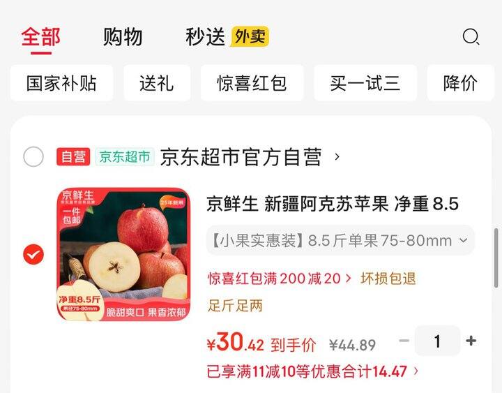 ❶ 京鲜生 新疆阿克苏苹果 净重8.5斤单果75-80mm
