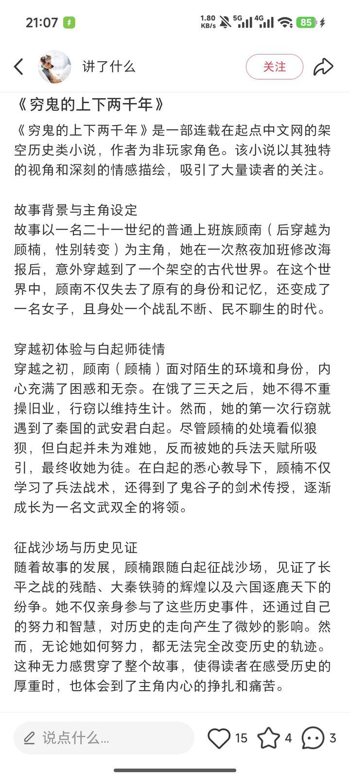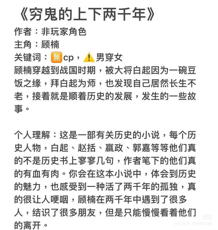 又名《顾楠的上下两千年》)是非玩家角色创作的架空历史小说,2017年起连载于起点中文网,核心是长生者顾楠跨越两千年的历史见证与追寻 。
