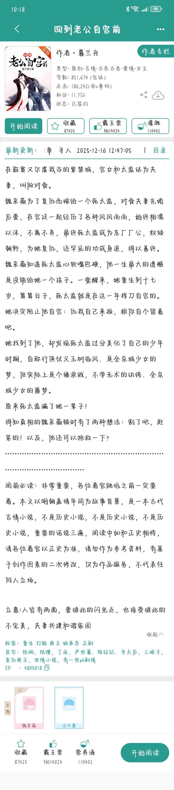 女主很聪明很正直,一上来就自己复仇,挺狠的。主要是女主五十岁重生,性情十分稳定,并没有像别的那些小学生写的那些重生文一样,不管多少岁重生,那回来身体年纪多大心里年纪就多大的狗💩情节。