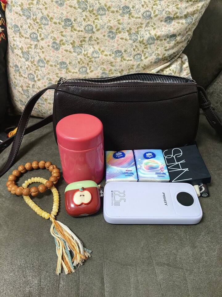 它虽然小,但巨能装,350ml保温杯、充电宝、Nars大白饼、口红、纸巾、口罩、蓝牙耳机、手串,全塞进去后,还有一丢丢富余~