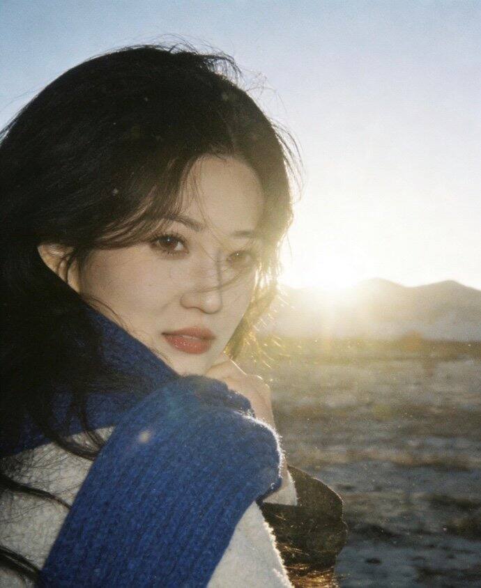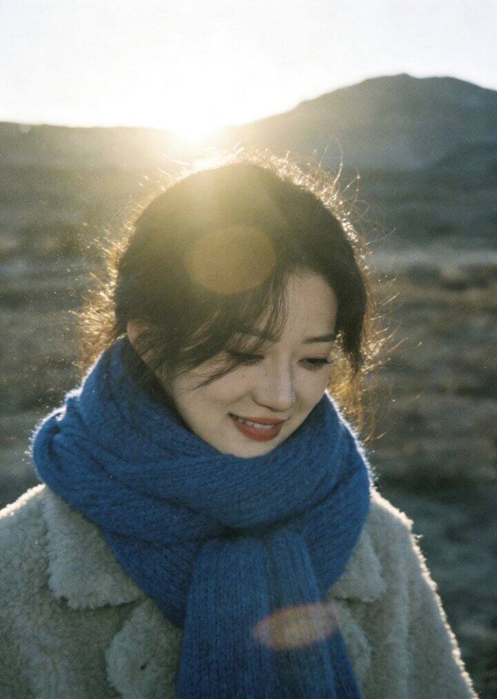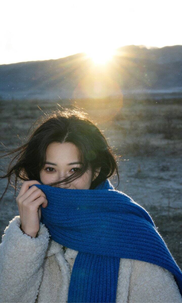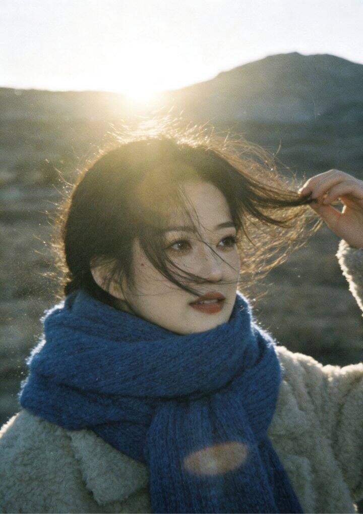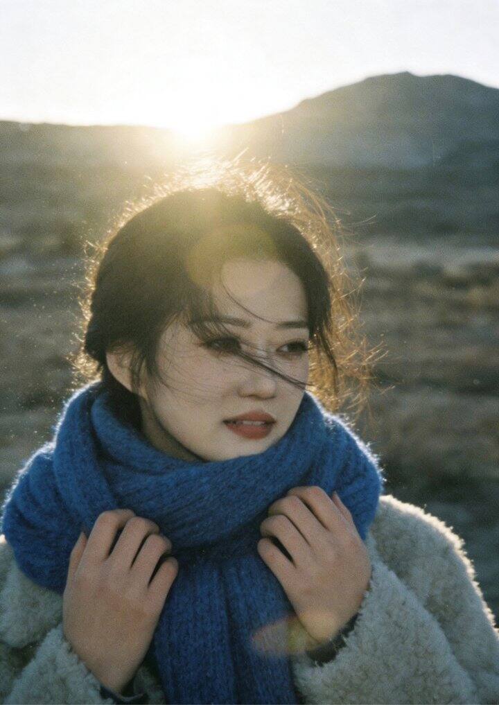 以上传照片中的人物为原型,去除所有背景服饰和发型,在完全保留人物原生面部特征、五官特点的基础上进行艺术化创作,生成10张照片,一幅具有电影感的胶片肖像,一位美丽的中国女生,凌乱的黑发在风中飘动遮住脸庞,眼神灵动地看着镜头。她在画面的左1/3处。她围着一条厚实的克莱因蓝色有质感的针织围巾,穿着一件羊羔毛外套上衣,背景是日出时分寒冷、干枯的荒野和远山。强烈的金色逆光直射镜头,产生巨大的镜头光晕效果,空气中有尘埃感。胶片颗粒质感,浅景深,自然原始的风格,青灰色滤镜,高噪点的胶片颗粒。比例2:3比例可调成其他,9:16,3:4或3:2等,追求动作角度多样化,“变换不同角度,动作,生成10张。原比例。