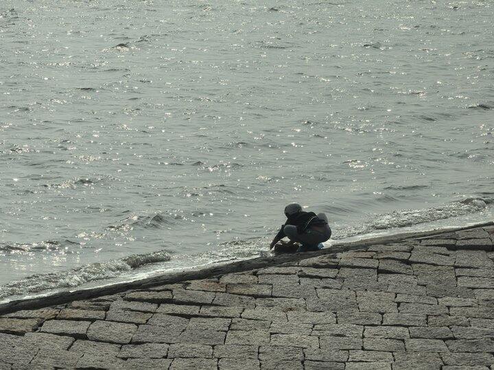 在海边看到一个外卖小哥自己在挖城堡