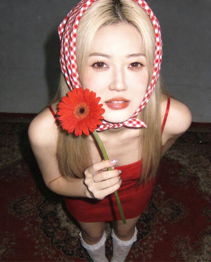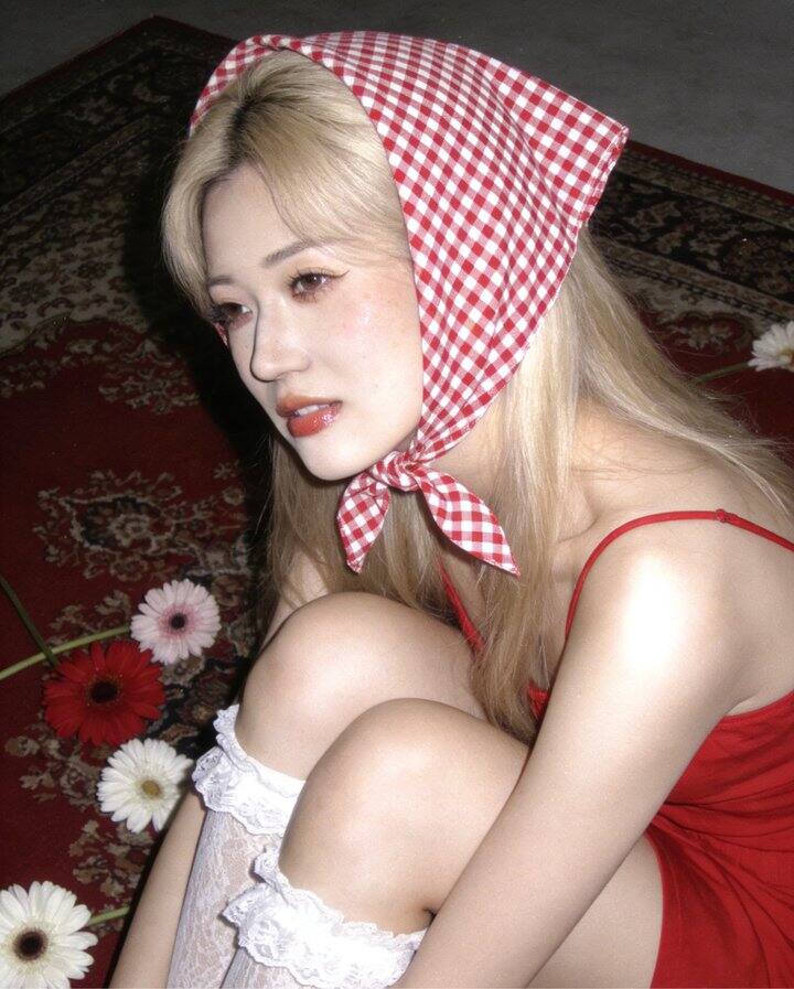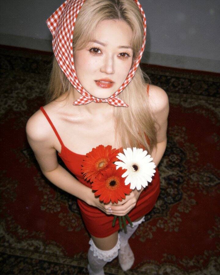 生成10张照片,3:4比例,人物动作、取景和角度丰富,保持人物长相不变,浅金色长发,没有表情,眼神放空,营造慵懒甜美的氛围。复古风格的少女人像写真,头戴红白格包脸 系带头巾,身穿红色吊带小裙子,腿穿白色蕾丝连脚袜。清透水光肌底妆+淡橘粉色腮红,腮红的位置有雀斑,眼影带珠光,颜色与整体妆容呼应,唇妆为透亮橘粉色,唇釉边缘模糊,脸上高光珠光明显。红色和白色的非洲菊(扶郎花),可手持或散落布置。场景:复古花纹的红色地毯作为主要背景,布置得简洁有氛围感。柔和朦胧的光影,突出皮肤通透感,整体画面带轻微复古颗粒感。构图:包含全俯拍躺姿正脸特写、半身特写、带场景的全身照等,人物姿态松弛自然,体现与花、场景的互动感,比如手轻触花朵、头发自然散落等。整体暗灰色调,闪光灯拍摄。
