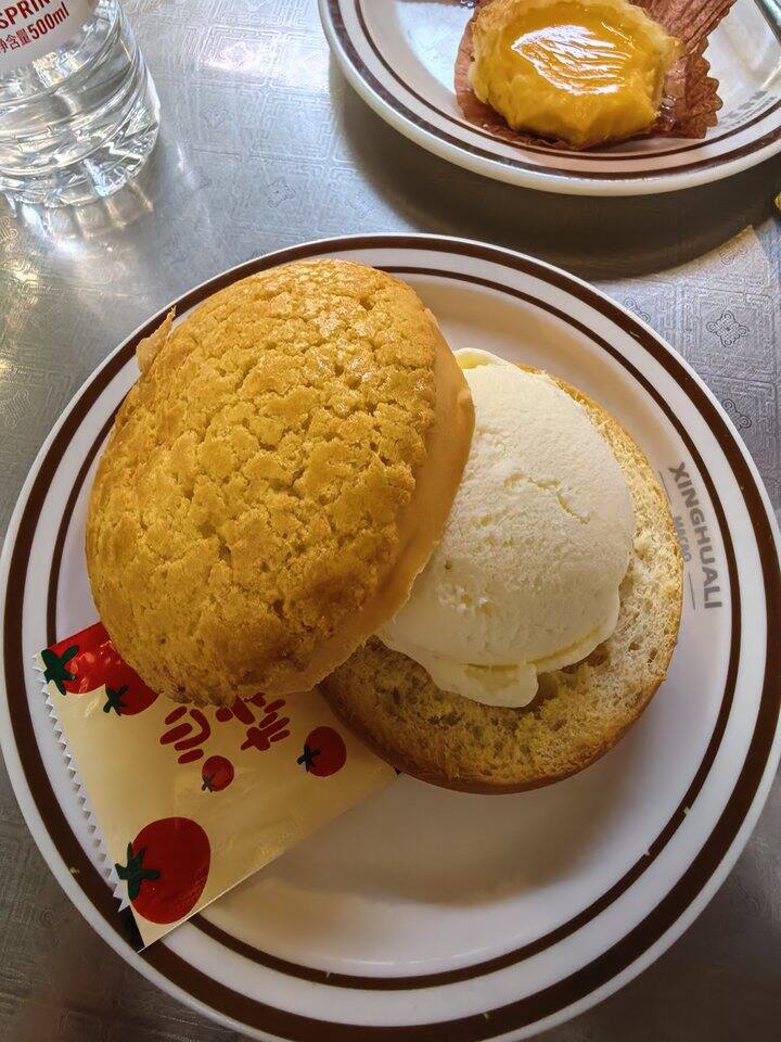 他们家的东西应该都是现烤的,这个菠萝包夹的冰淇淋不容易化,和菠萝包一起吃超棒,蛋挞是他们的金牌,刚出炉好烫,我妈妈说姜撞的最好吃。吃完还打包了他们家的猪扒菠萝包芝士汉堡给家里孩子,都说好吃。