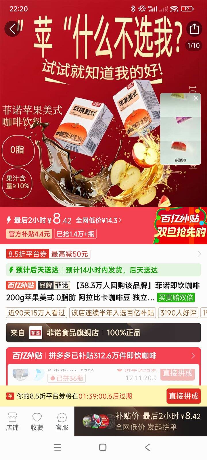 还喝了菲诺的盒装苹果美式,冰箱里冷藏一下跟自己拿苹果汁与咖啡兑的差不多,我挺喜欢的,我在拼多多买的应该是六块多六盒