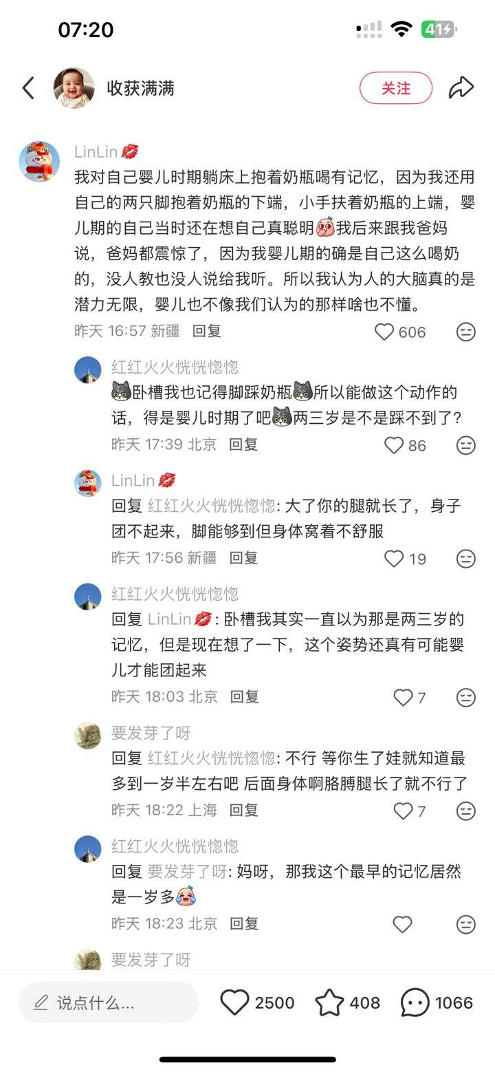 原来好多人是有婴儿时期的记忆呀!可惜我木有,我最早记忆甚至是在上幼儿园时候的一些片段了,那会都4岁了