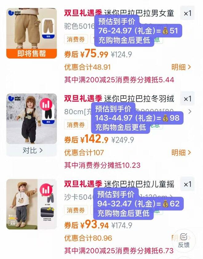 凑单思路:如果领到300−25的母婴卷可以凑成大于等于300的忦,就与预估忦差不多了;