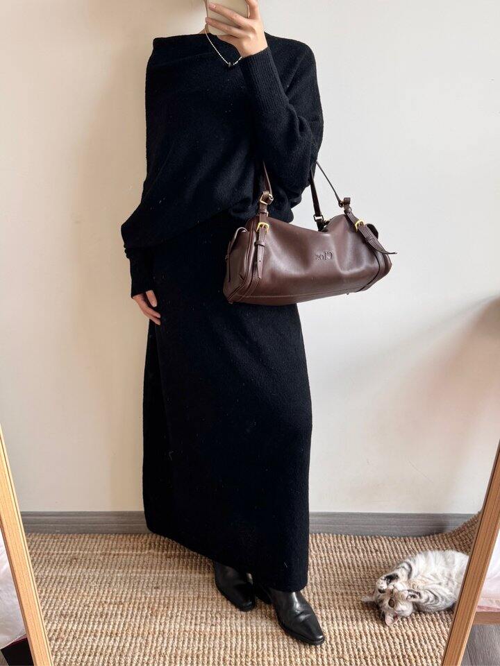 缺点就是上衣一字领感觉不太好穿,不知道是不是我肩膀太窄了。而且上衣不太适合内搭,穿外套有点麻烦。更推荐入手裙子,冬日穿搭保暖和实穿度会更高。