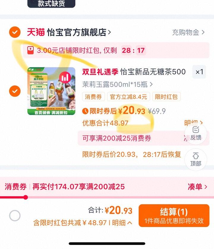 怡宝无糖茶茉莉玉露丨1.39/瓶