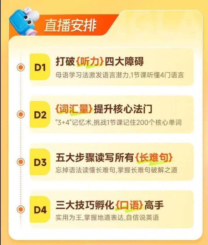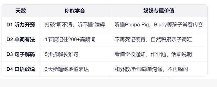 不管是工作需要,还是个人提升,亦或是想辅导孩子,这 4 天免费试听营都值得你试试!别让英语成为你的晋升绊脚石、沟通拦路虎,更别让孩子的英语启蒙因为你的 “不会” 留下遗憾。