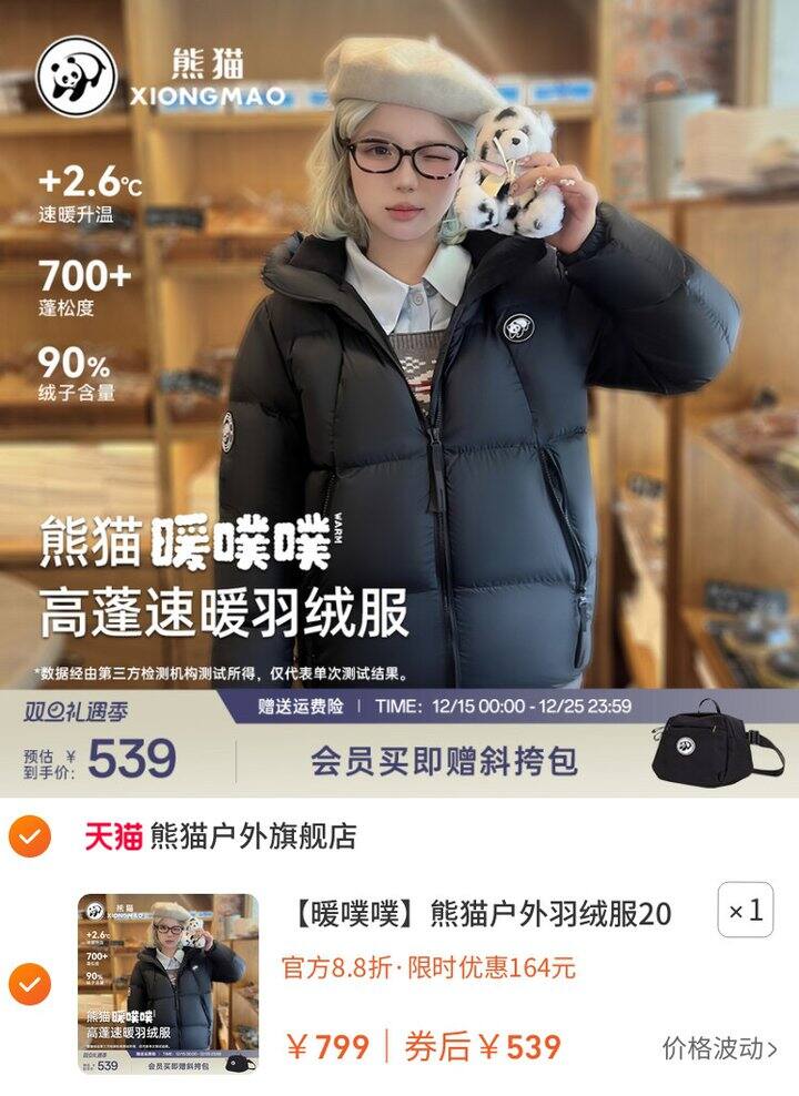 1、【暖噗噗】熊猫户外羽绒服2025新款90绒秋冬防静电保暖蓄热外套https://m.tb.cn/h.7faT9ao弹107.8礼金,淘金币抵扣23