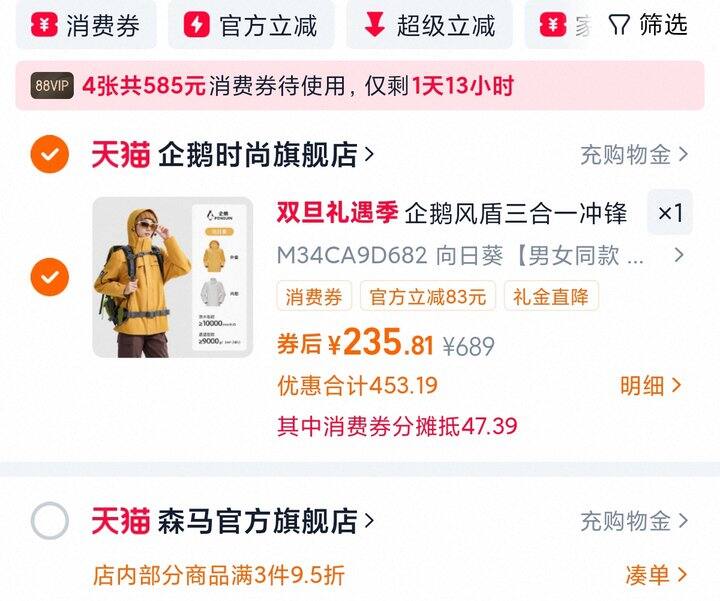 1、企鹅「风盾」三合一冲锋衣女2025秋冬新款户外登山服三防夹克外套https://m.tb.cn/h.74NyMLT弹77.8礼金,淘金币页面加购抵扣15,23首购礼金