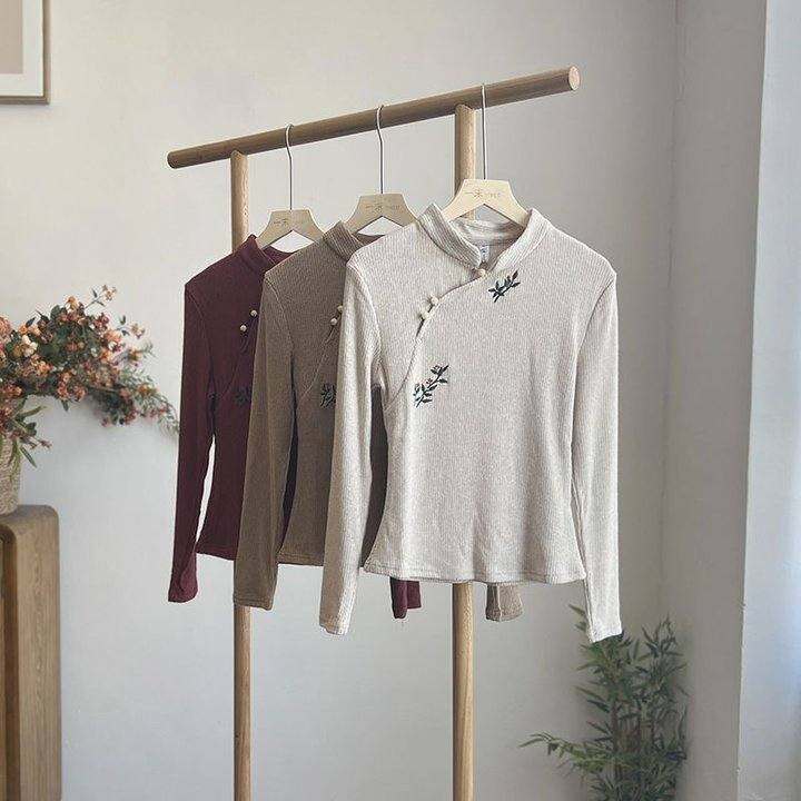牧之art:婵娟 针织刺绣打底上衣 中式国风修身HY3093