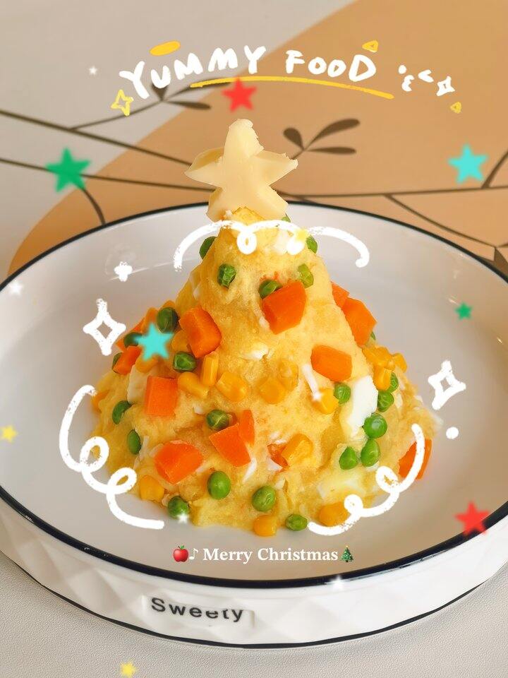 早上起来做了土豆泥圣诞树,放了胡萝卜丁,豌豆,玉米和鸡蛋,还用崽的奶酪做了个⭐