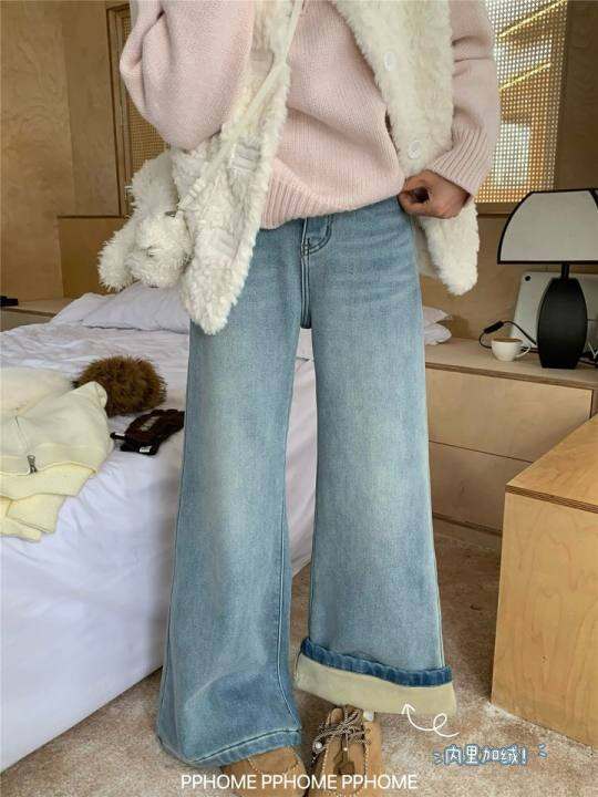 PPHOME自制~韩调奶蓝 覆古浅蓝微喇牛仔裤高腰显瘦加绒阔腿拖地裤