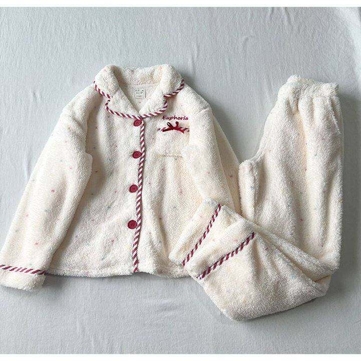 果~轻红品圣诞睡衣女秋冬中厚绒米杏色星星点点家居服保暖套装