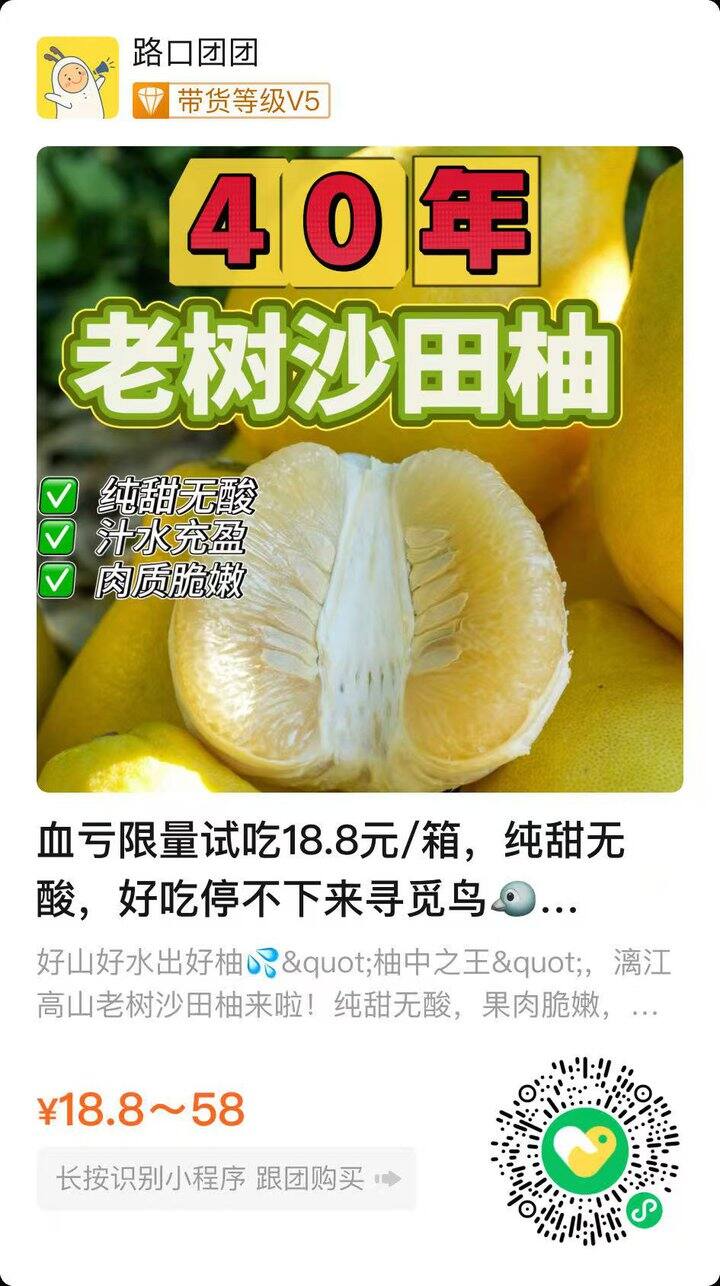 4️⃣0️⃣年老树沙田柚【限量试吃】 净重:3.5~4斤/箱(2个装) 18.8元 缺点就是籽较大
