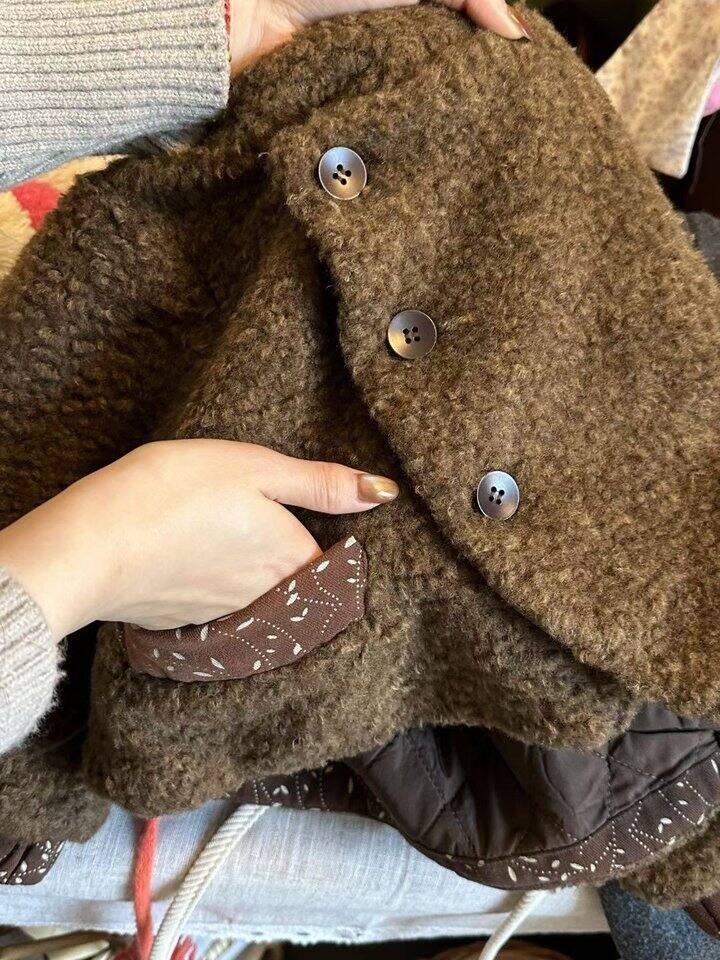焦糖色羊羔毛外套软乎乎的,斜扣设计搭配撞色贴布口袋,细节感拉满