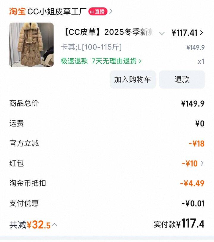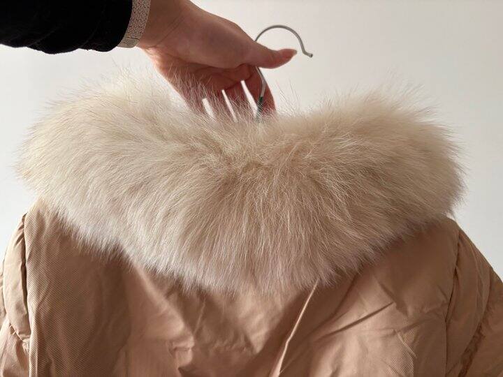 117拿下一件长款鹅绒服,还是狐狸毛领的,很柔软,长度到膝盖,修身版型。充绒量还可以,胳膊、下摆摸一摸都有。