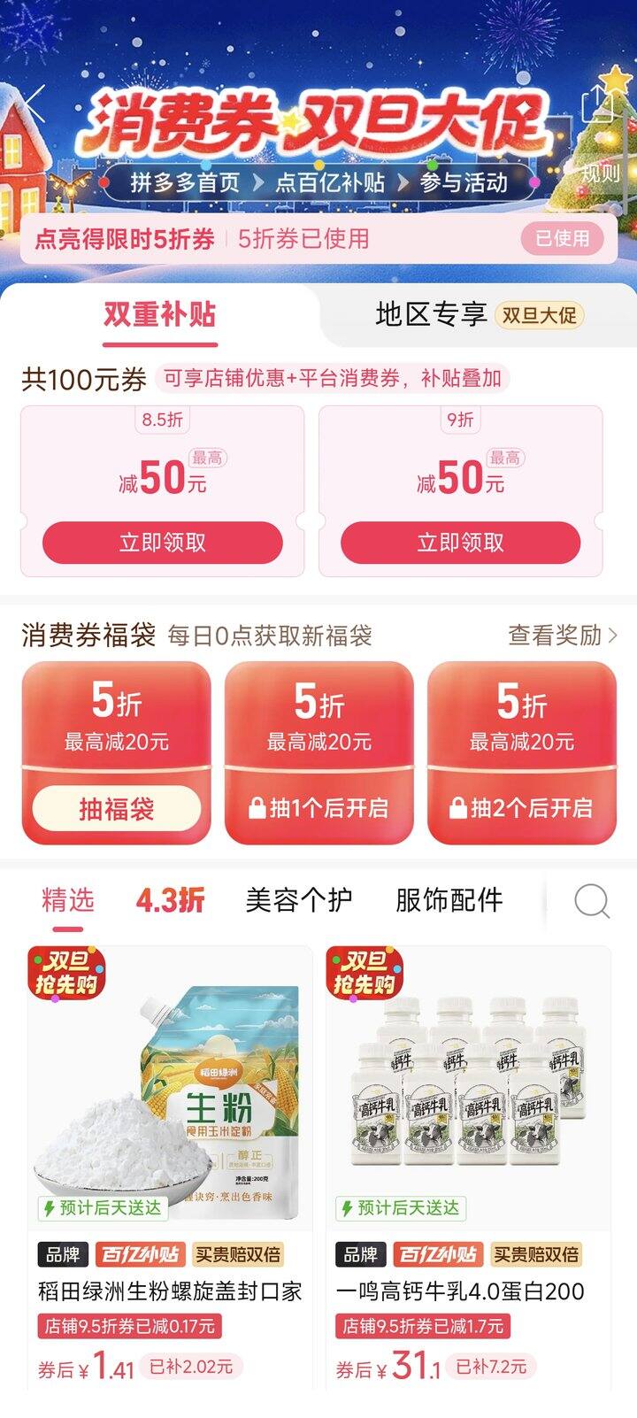 5、百亿补贴点亮五折经常一周一次,最高抵扣15元,我用来买牛奶特别香。