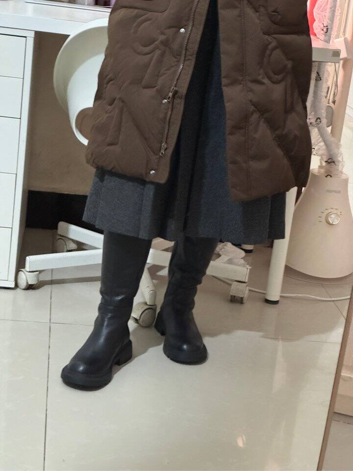 搭配百褶裙的时候一定要穿窄桶靴子,露出细细的脚踝,走起来能看到百褶裙的裙底摇曳生姿,很美