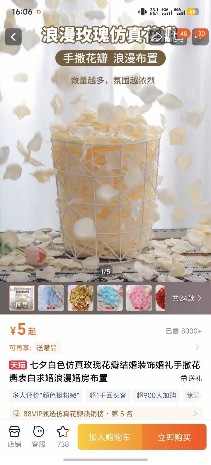 2.假花瓣和包装纸。接亲时新郎进门时撒的,本来想买礼花,但是酒店地毯太难打扫了,换成假花瓣用包装纸装着,伴娘抛撒,也很好看。就是颜色太浅了,香槟和奶白基本一个颜色,还好买了浅粉色。需要自己手动搓开,要得一会儿时间完成这个工作。