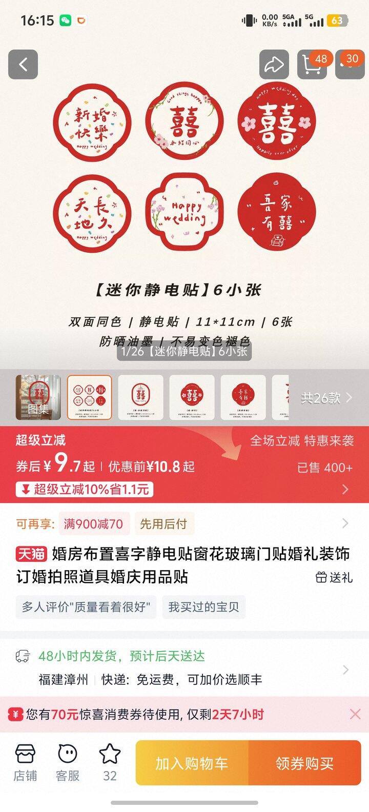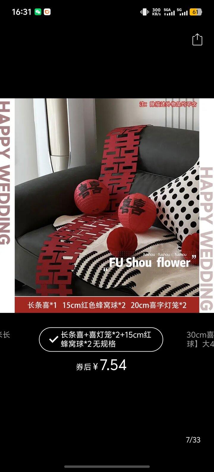 12.喜字,大大小小都买了,多买点,这个最好看,小喜字我没买够,然后从上面那个套装里的长条喜里剪了些喜字下来用[哭笑]