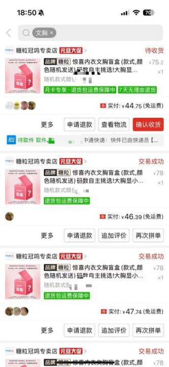 糖粒这个牌子的文胸,我从淘宝京东和多多一路买,价格一路跌,从一百多,八十多,七十多,六十多。到现在多多只要四十多,我陆陆续续买了六个了,盲盒款式没踩雷很好看,大🐻友好,宽肩带支撑包裹我都满意。只要放在收藏夹,啥时候降价到四十多我就买一个,我自己买够了给我妈买。没想到2025年了我还能四十多块钱买品牌哈哈,是我年度最满意性价比单品之一。