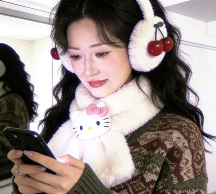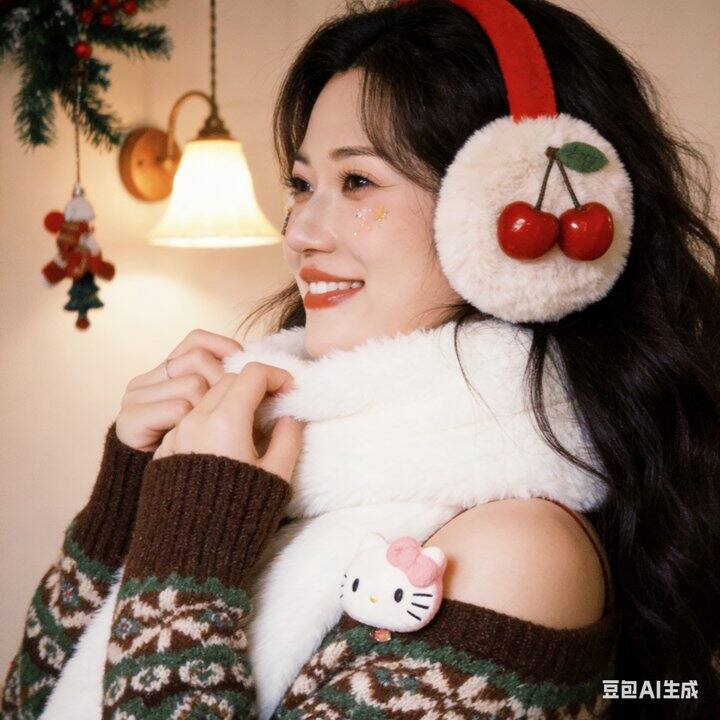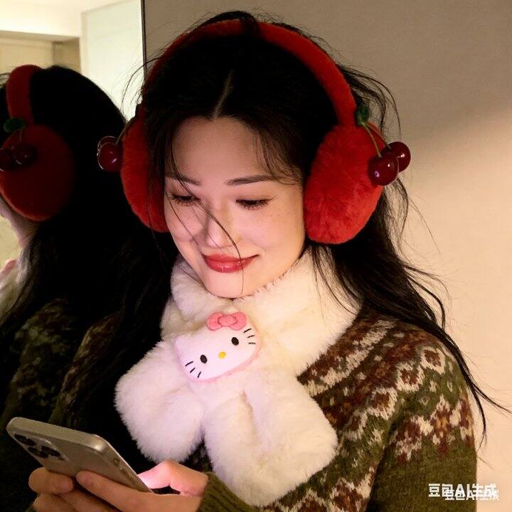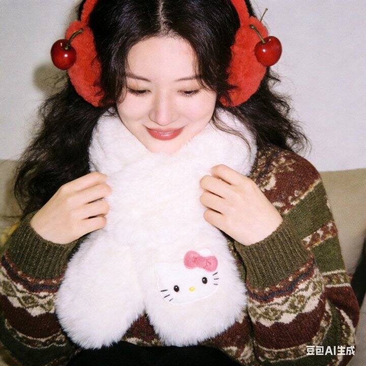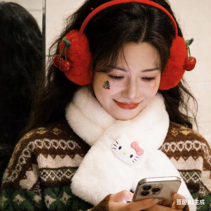 帮我生成九张图片,人物五官比例100%不变,留着蓬松的深色长发,搭配红色樱桃造型的毛绒耳罩,造型可爱又带着冬日的软糯感;她以手持手机、低头轻看屏幕的姿势出镜,嘴角微扬露出柔和笑意,姿态松弛又尽显娇俏温柔的神态;穿搭是带有复古花纹的棕绿配色毛衣,外搭厚实的白色毛绒围巾,围巾上还别着粉色Hello Kitty装饰,既贴合冬日氛围又添了几分甜美俏皮。环境是室内的温馨空间,背景可见浅色墙面与镜面反射出的部分身影,整体氛围闲适又带着日常的松弛感。光线是室内的柔和暖光,人脸区域被暖光晕染得肤色粉嫩柔和,而背景环境的光线相对均匀偏浅调,形成了人脸与环境间“暖-柔”的明暗过渡,同时人脸的暖调与背景浅色调的柔和感相互呼应,没有强烈的冷暖反差;不同物件的明暗对比也很自然,比如毛绒耳罩的蓬松纹理在光线下呈现出柔软的明暗层次,毛衣的针织花纹因受光角度不同展现出细腻的深浅变化,白色围巾的毛绒质感也在光线下透出轻盈的光泽感。拍照角度是近距离的平视构图,人物出镜的部分展示到肩胸区域,整体画面聚焦于人物上半身,构图紧凑又突出了温柔松弛的日常气质。比例 1:1。