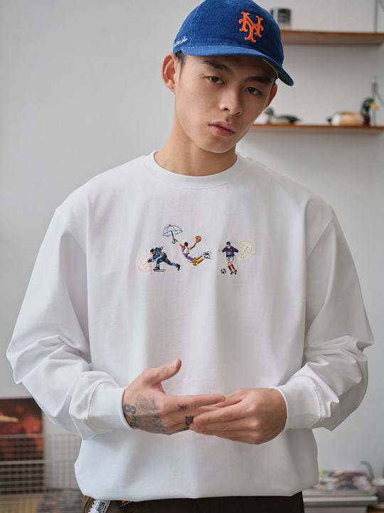 战斗运动人物刺绣长袖t恤纯棉宽松休闲美国覆古基本圆领