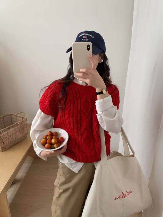 韩系小众覆古麻花纹短袖针织马甲背心女早秋新款宽松叠穿毛衣上衣