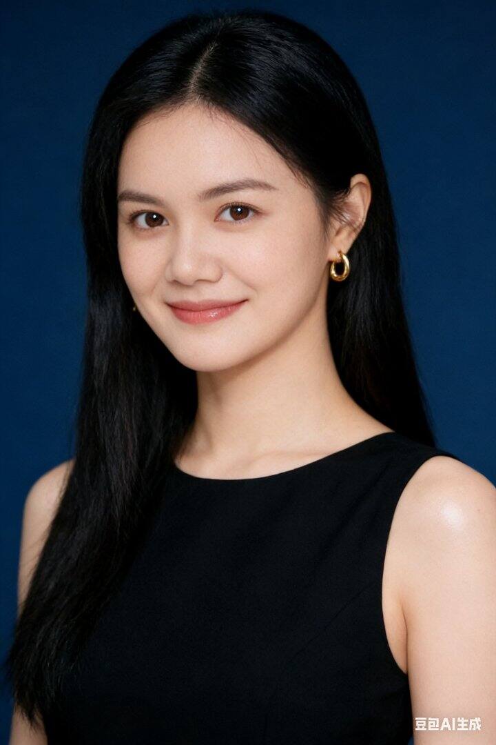 指令3: 帮忙生成一张高智感职业证件照,背景深蓝色,生成一张现代感的职业形象照,整体风格参考商务人像。画面为上半身构图,背景使用带有纹理的深蓝色渐变摄影棚背景,灯光柔和自然,突出真实肤色与层次感。画面清晰高质,面部保持对焦,背景轻微虚化以营造空间感和专业氛围,皮肤质感通透气色好,头肩比要正常适度。 人物穿着无袖黑色连衣裙,设计简约干练,头发黑色自然直长发,肤色自然有光泽,金色耳环,整体气质现代且优雅,神情放松,自然自信,眼神明亮有神,微笑真诚。整体画面应传达干净、精致、专业的感觉,适合作为商务与职业形象照。原比例!不要改变五官比例!保持健康有活力的状态。