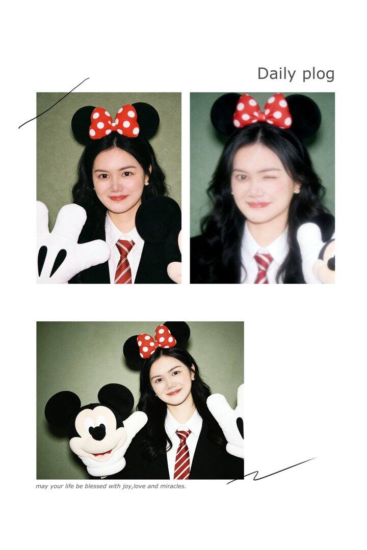 指令2:生成10张照片,比例4:3。保持人物长相百分之百不变,半身照片,人物居中偏下。 风格滤镜:日系胶片风格人像写真,采用富士Provia胶片滤镜,有细腻的胶片颗粒感。 背景:低饱和暗绿色纯色磨砂墙纸背景 人物造型:黑色长发微卷,米妮蝴蝶结耳朵发箍,手上套着米奇大手套。身穿黑色外套+白色衬衫+红白条纹领带 妆容:皮肤通透且脸上,脸上有明显腮红,鼻头和下巴也有腮红,唇釉,画面朦胧。 表情:微笑、眨眼、做吃惊样、双手捧脸、单手捂嘴、可爱嘟嘴等甜酷俏皮可爱表情动作。 3️⃣把生成的图片拼接成两宫格照片