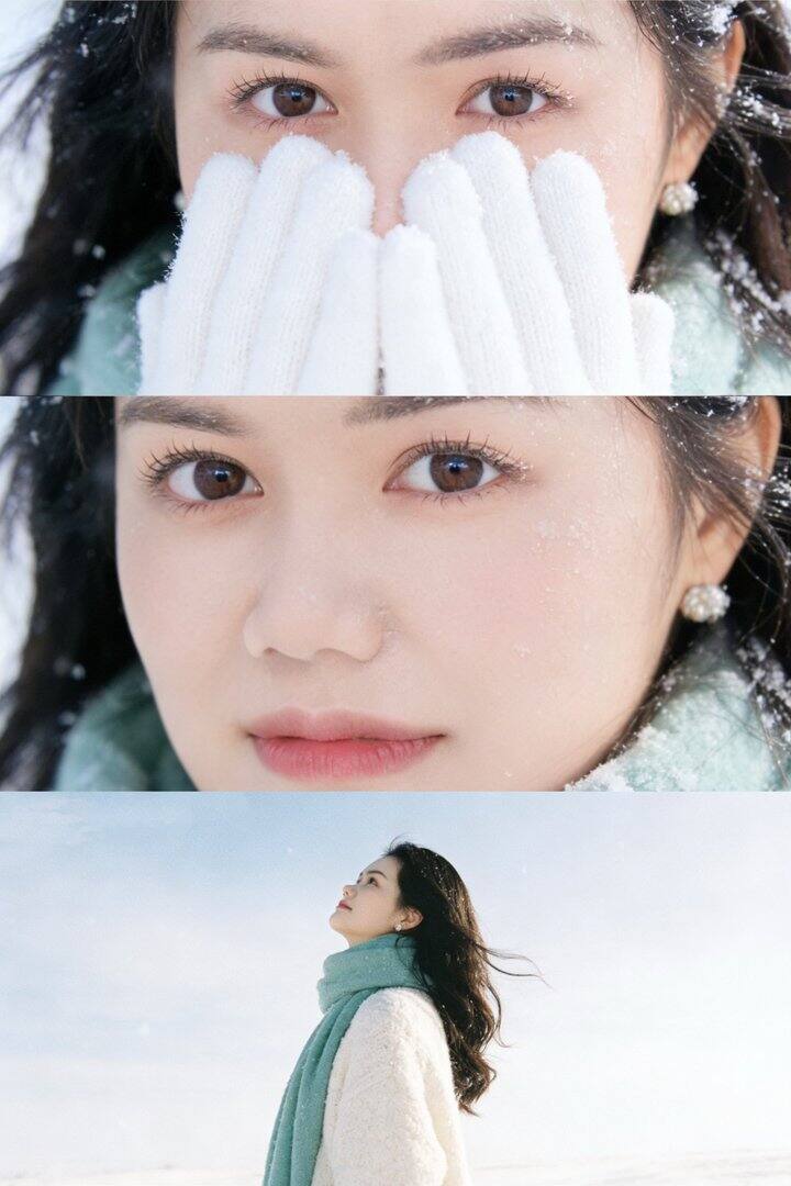 指令1: 生成一张三宫格冬日电影感叙事写真,式为上中下3屏均分拼图,需要保持图中人脸相似度和发型不变,在冬日的雪地里。上身穿着一件质地柔软、蓬松的干净白色厚实马海毛或羊绒针织毛衣,脖子上围着同材质的厚围巾,颜色是饱和度很低的薄荷绿或淡青色。眼神具有故事感,光影柔和,画面整体充满梦核发光感, 朦胧感。 整体风格: 日系纯欲风,情绪人像,胶片质感,柔和的自然光,高光过曝感,色调偏冷但肤色温暖,颗粒感,构图干净。整体为晴天清冷孤寂的冬日大雪场景,细腻雪花飘落,cinematic 质感,皮肤通透亮白均匀无暇,冻得白里透粉,脸颊淡淡的粉嫩,呈现少年感,雪花点缀,睫毛根根分明,皮肤清晰,接近裸色的唇部。 上宫格: 中景镜头,主体侧面站在茫茫雪地中,头发被微风吹拂,仰头望向天空,神情清冷安静,背景是纯净的天空和雪地。 中宫格: 极致大特写镜头,只展示女的脸部,聚焦在脸颊和头发上沾着雪花,眼睛清澈明亮,直视镜头,嘴唇微张,有一种脆弱和亲密感。 下宫格:近景镜头,女孩在雪地里,双手戴着白色手套捧着脸颊,对着镜头露出甜美羞涩的微笑