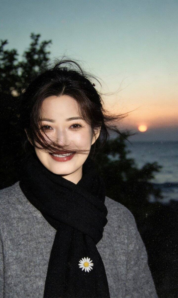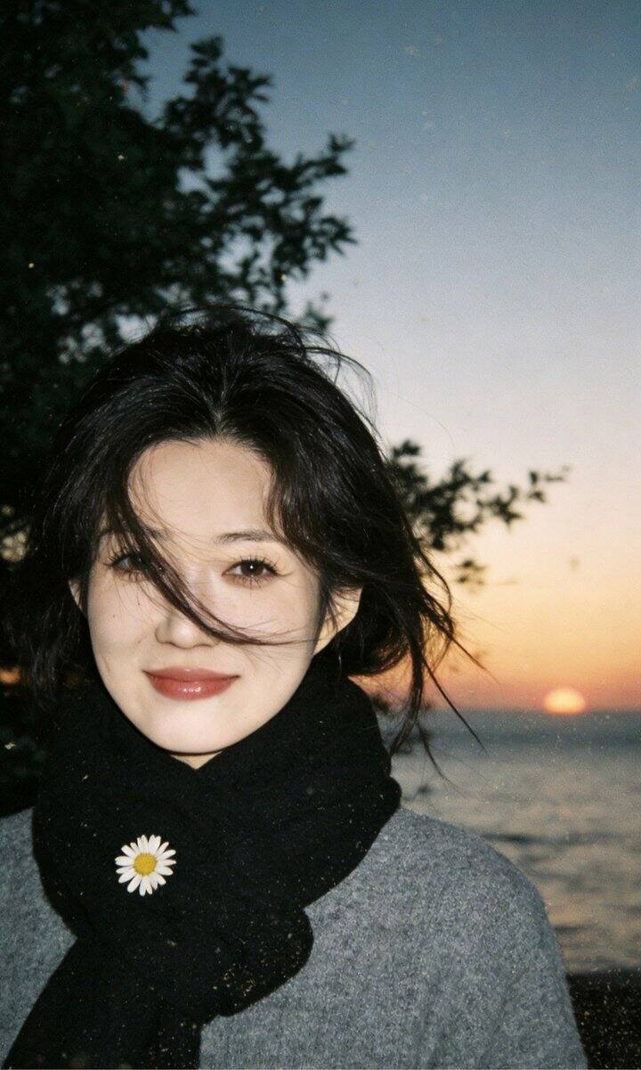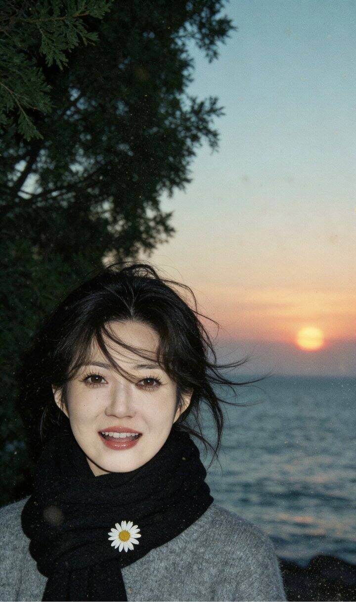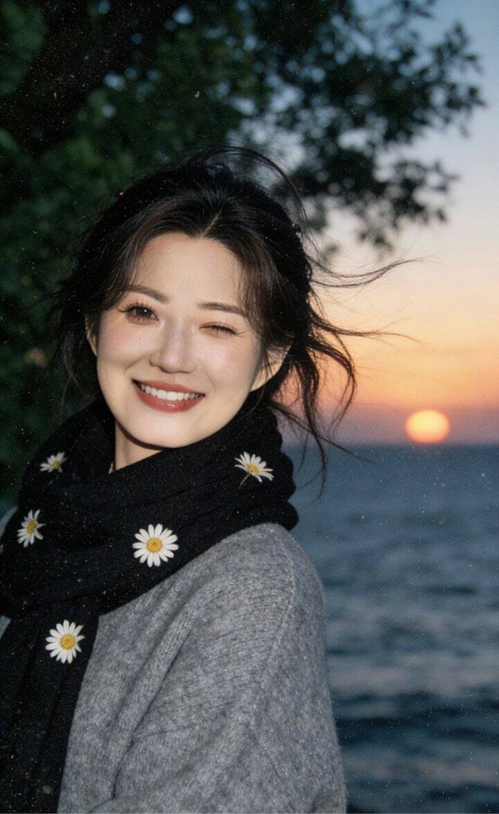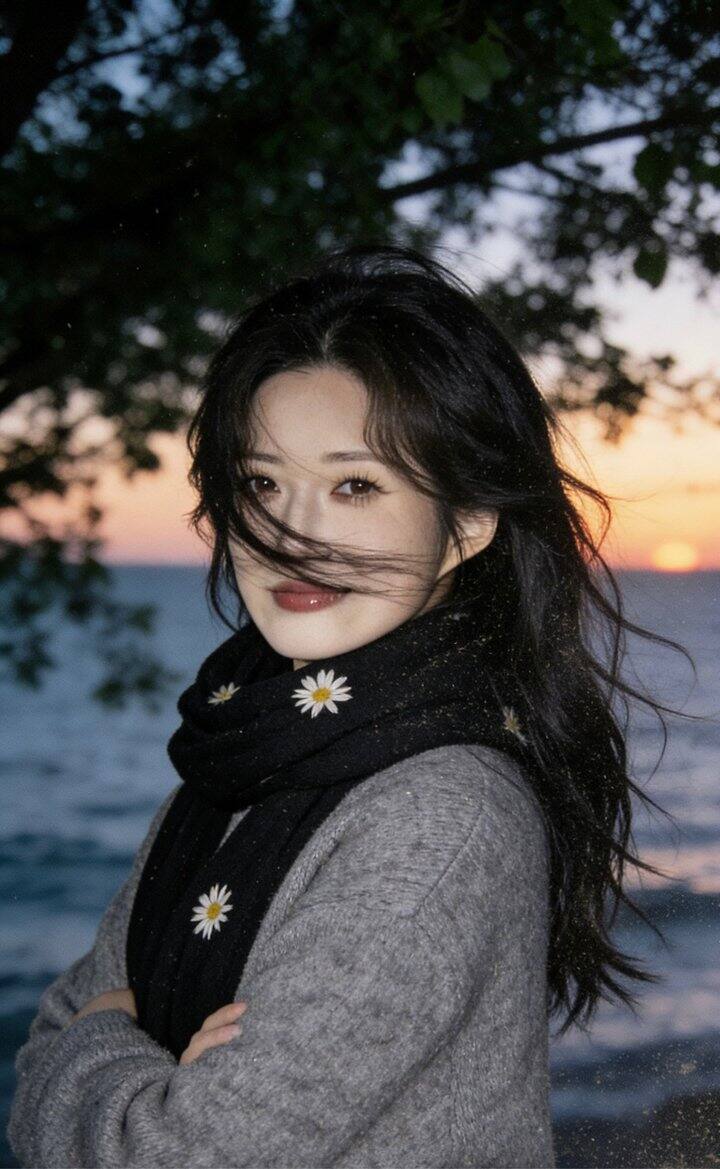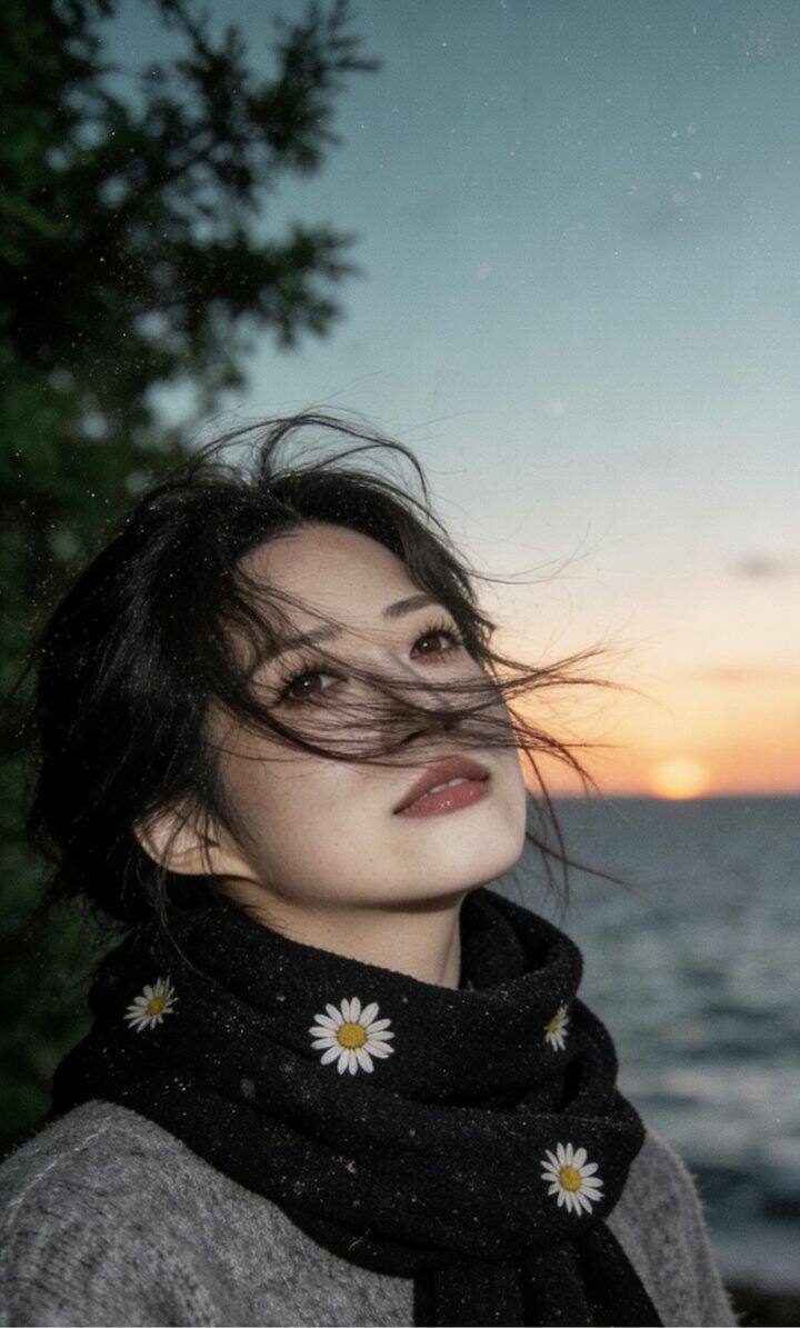 以上传照片中的人物为原型,去除所有背景服饰和发型,在完全保留人物原生面部特征、五官特点的基础上进行艺术化创作,生成10张照片,一幅具有电影感的胶片肖像,一位美丽的中国女生,凌乱的黑发在风中飘动遮住脸庞,眼神灵动地看着镜头。她在画面的左1/3处。她围着黑色围巾带小雏菊、穿着灰色羊毛上衣,背景是日落时分寒冷、暗绿色的树清冷的海面。空气中有尘埃感。胶片颗粒质感,浅景深,自然原始的风格,青灰色滤镜,高噪点的胶片颗粒。比例2:3比例可调成其他,9:16,3:4或3:2等,追求动作角度多样化,“变换不同角度,动作,表情,生成10张。原比例。
