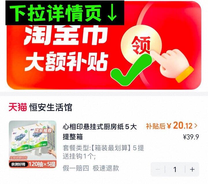下拉详情页进入淘金币页面抵扣,一提加大加厚,一提顶3包,可代替抹布