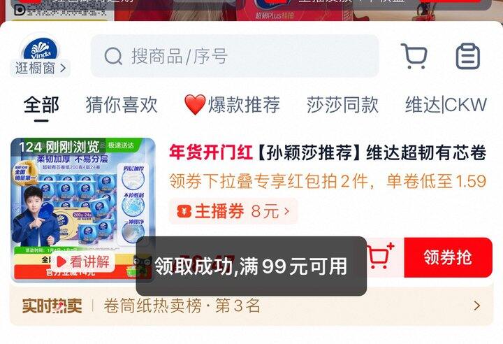 右上角直播间进去,购物袋找到这个🧻,领99-8