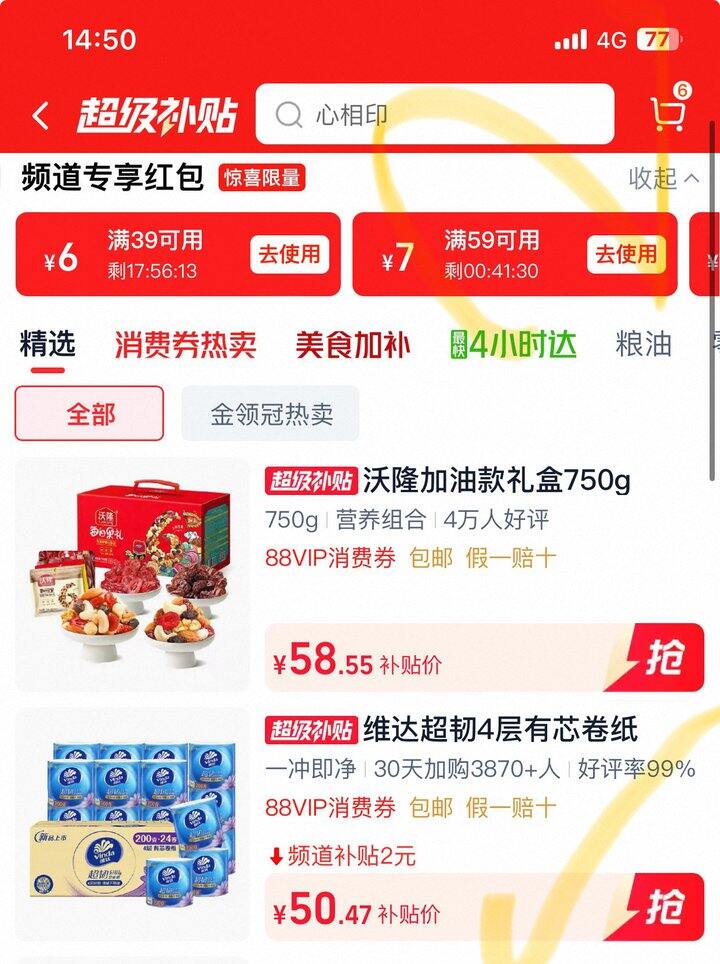 收藏,猫超首页点击超级补贴,找到它加购2件,领59-7