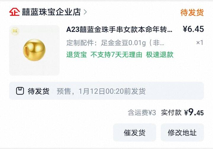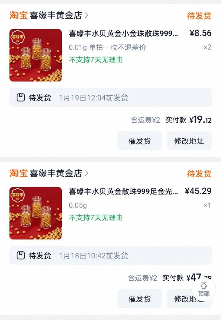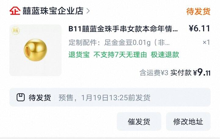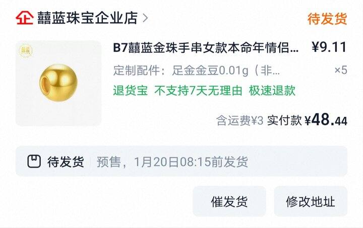 除了400-30不行,其他的红包都很好。红包出来后还是在当前页面搜“囍蓝金珠”,但是并不是所有链接都能用红包。按销量排序,下拉找B开头的链接试。它家15天发货,可以攒单。我今天有个号得了50-10,克价911。