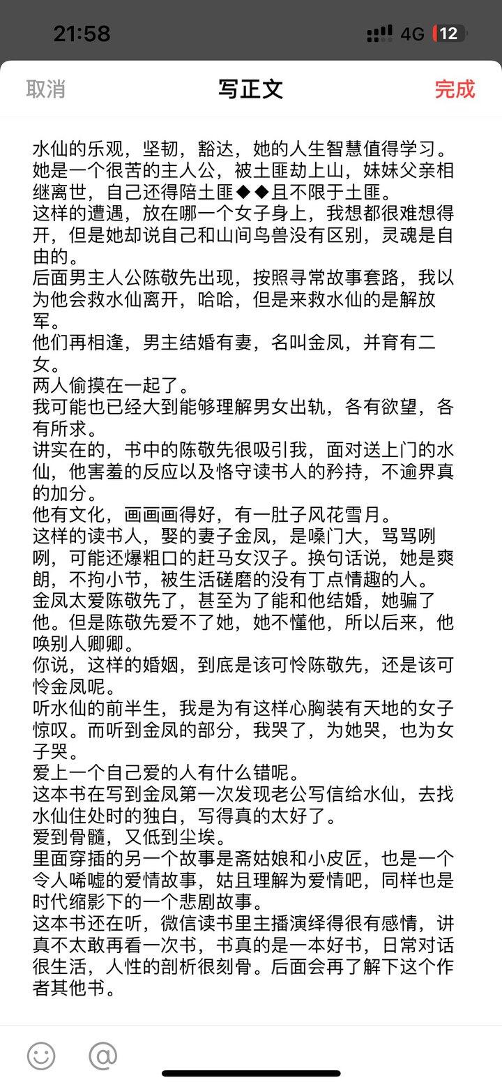其实我生活中就有翻版的金凤和陈敬先,只是他们之间没有水仙。婚姻可能对部分人有七分甜三分苦,但对于陈敬先这种在婚姻中灵魂无处安放的人,婚外的水仙倒是给他的灵魂安了个家。