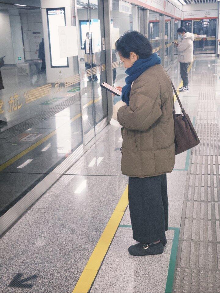 随手拍完我自己,边上站了大姐,我预计应该45➕了,有几缕白发,打扮得简约chic,再看我自己,哈哈哈,真的太随意