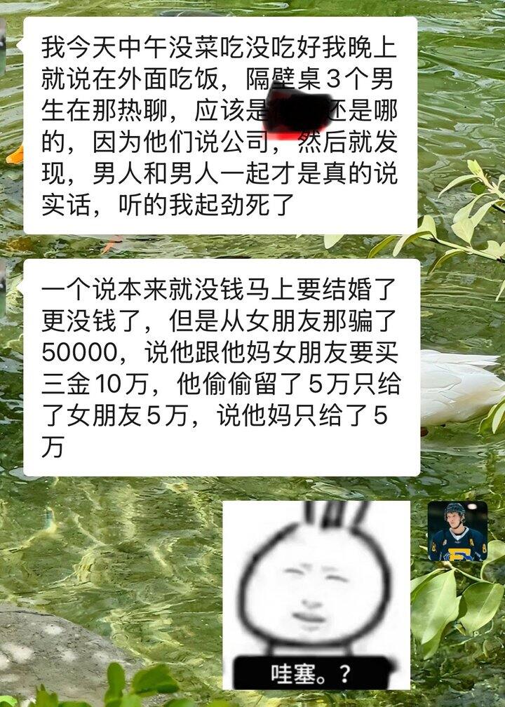 外加一则昨天同事分享的八卦,男的老说女的捞钱,拜金,精于算计,但是,真正能捞真正精明的不就是他们自己,骗父母的钱还把锅扣女的头上[鹿呵呵]
