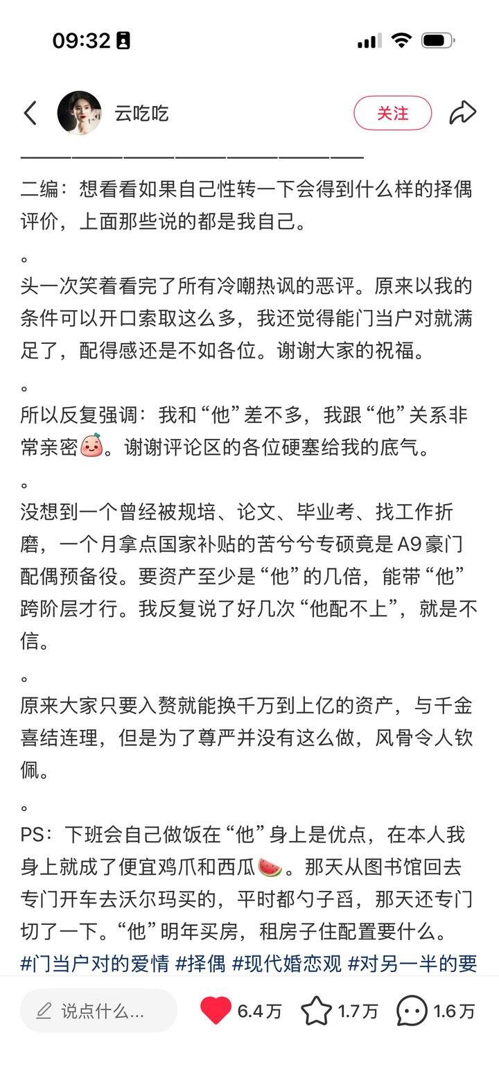 去年还是前年,我就和朋友聊过类似话题,把我们的自身条件性转一下发小红书相亲帖,不知道有多少人吹捧,没想到今天就看到了这个,评论区的男的真的把人笑死[哭笑]原来一个所谓优秀男人,入赘都需要女方亿万资产,男的配得感也太高了吧,所谓优秀男性不过是别人口中普通女性而已[鹿呵呵]