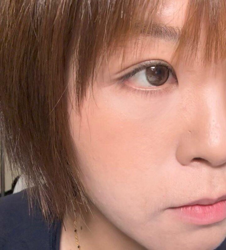 图4: 荔萌腮红LG03茶叶蛋的水光感,没有破坏底妆,也不显瑕疵,这个腮红一定要用刷子戳上脸(刷子用的菲丝加芬yy52),实际颜色没图片那么黄,就是杏粉色