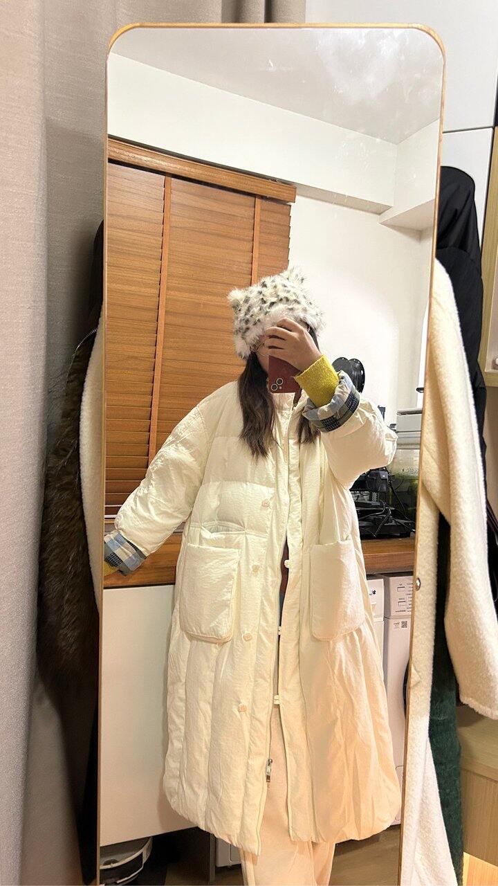 面料不是近两年常用的泡芙,是软软的棉料(可能不耐脏),充绒有227g!,很有设计感很文艺,穿着也不重,这个帽子也推荐,pdd买的几块钱