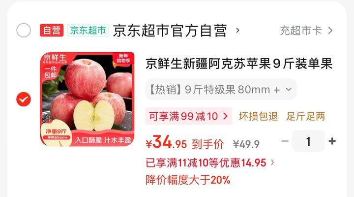 ❶ 京鲜生新疆阿克苏苹果9斤装 特级单果80mm+