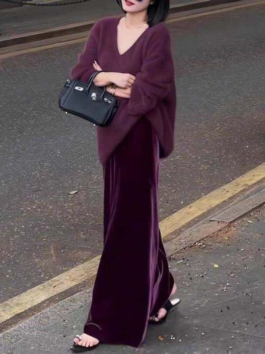 配上一条紫色丝绒小衫的紫色丝绒裙。跟主图穿出来效果差不多。我买的加绒的质量很好,裙长很长到脚踝。搭黑色打底上衣啥的也很不错。腰头很宽不爱跑,我以前买过一个窄的巨爱跑。这价格反正闭眼买吧巨值。