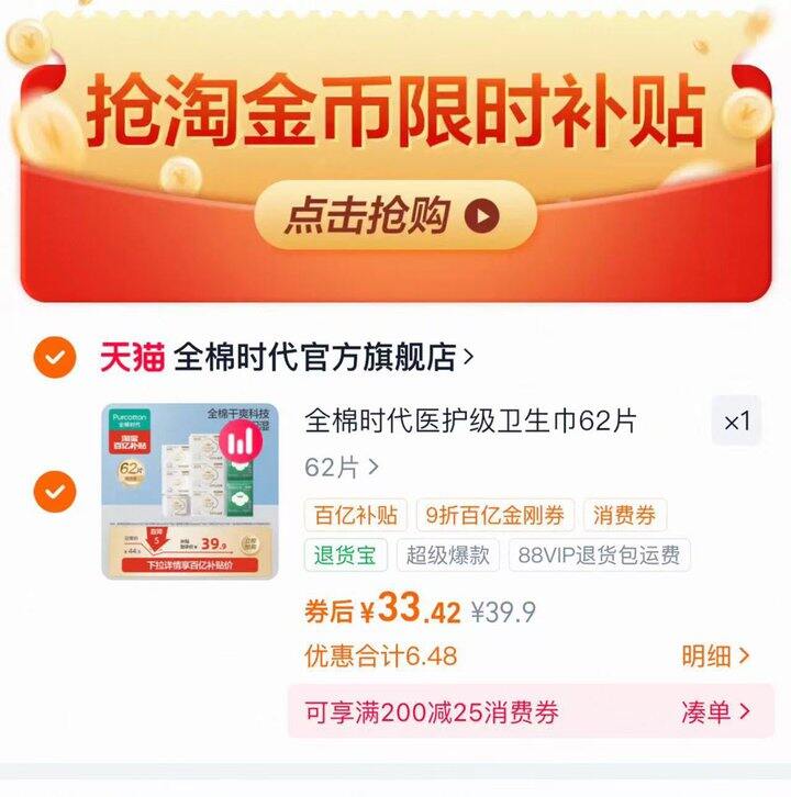 💰4/包 全棉时代医护级卫生巾奈丝公主