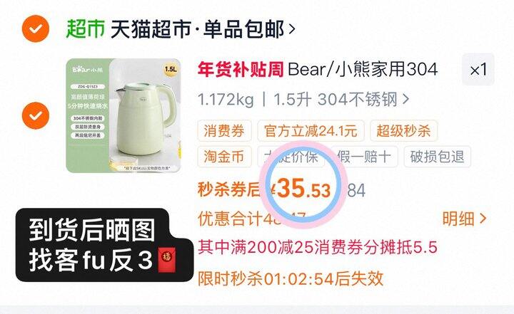 32💰小熊电水壶家用1.5L