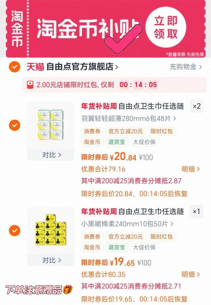 自由点卫生巾日夜用组合弹红包🧧下拉拍3件💰19.6一件起